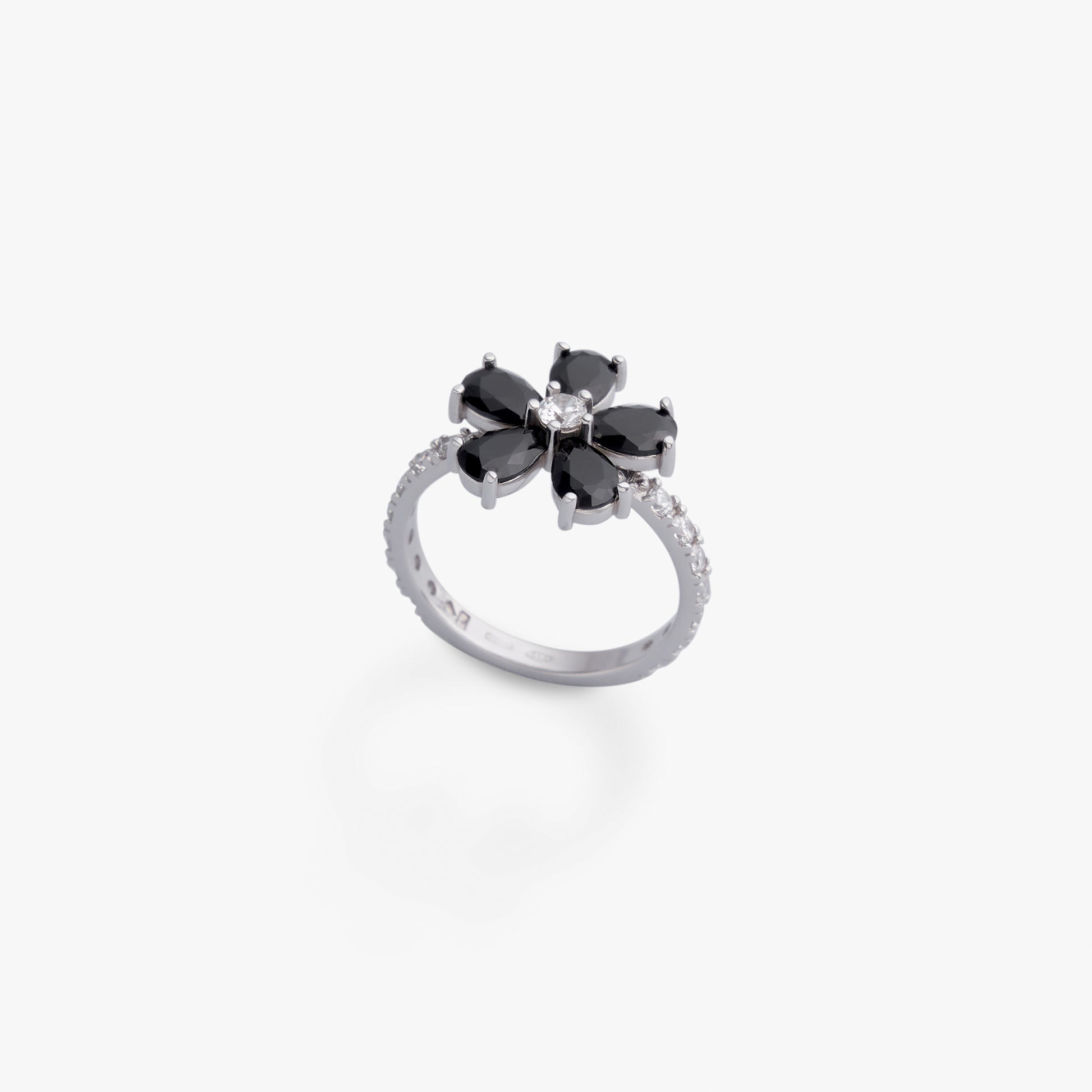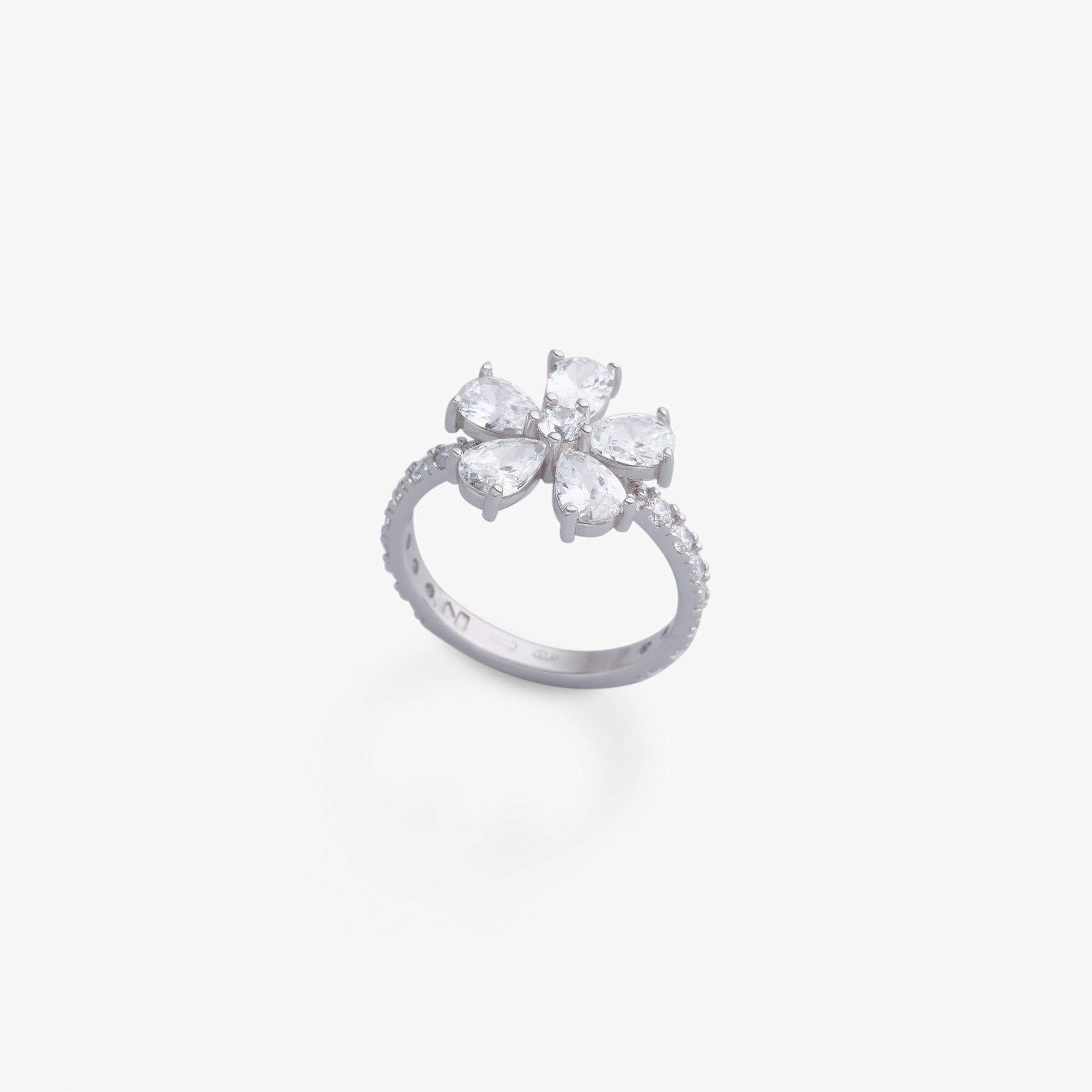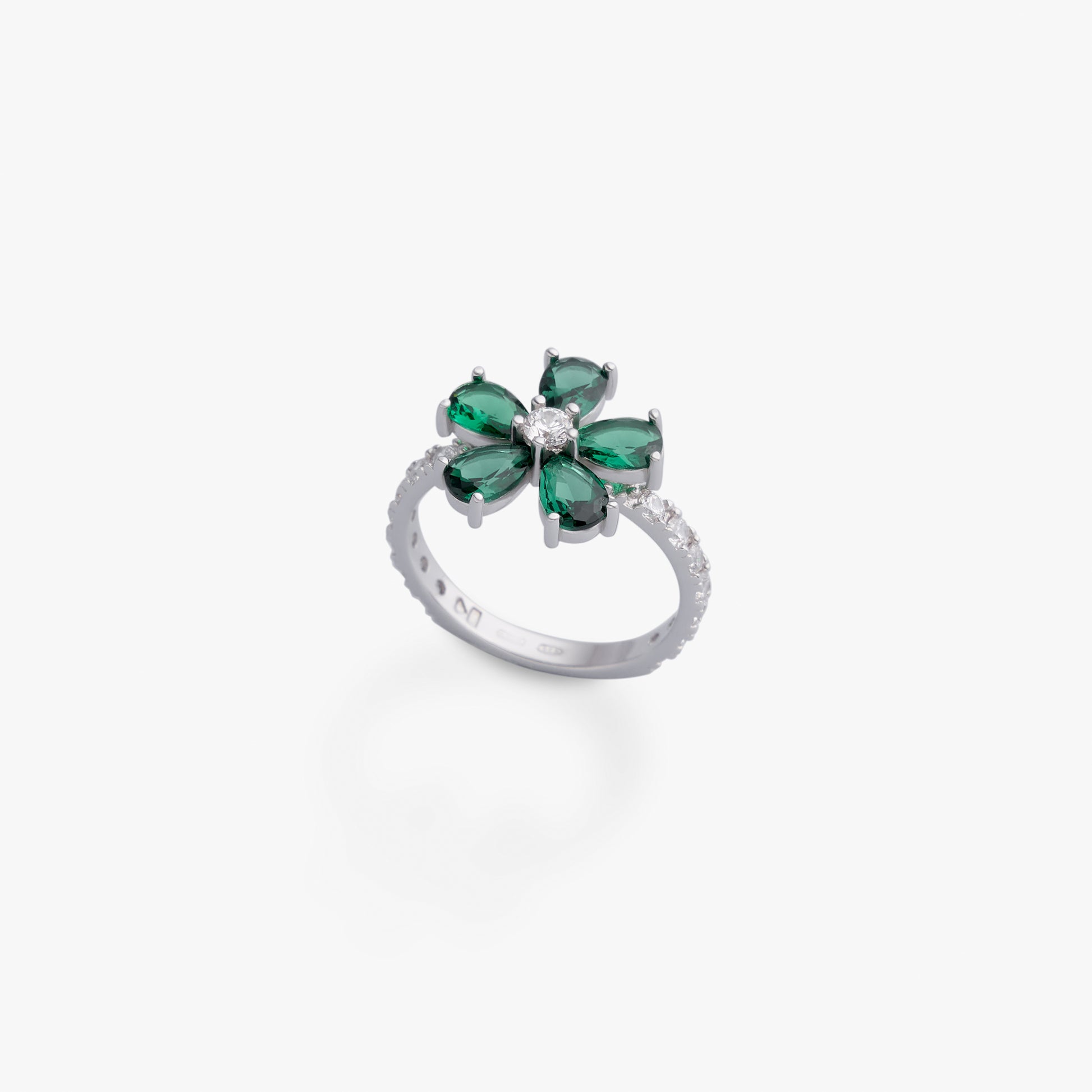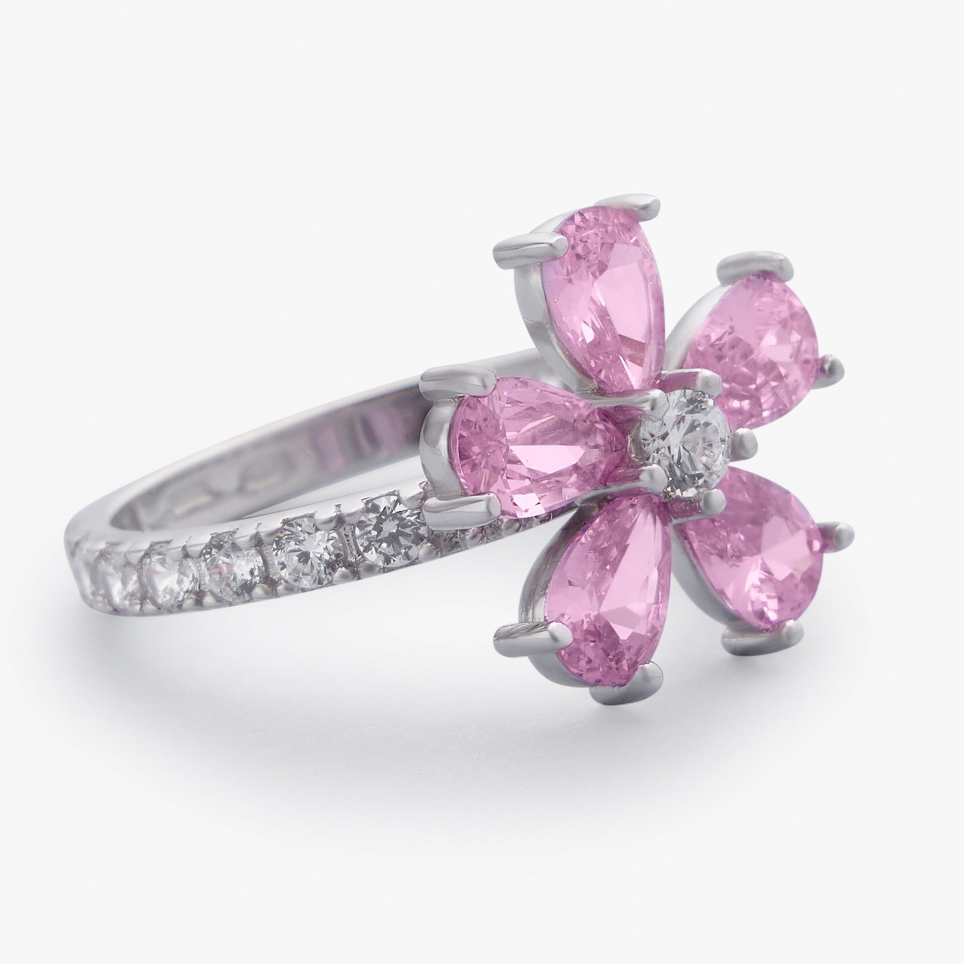 The ring from the My Garden collection has a simple line but stands out and shines on the hand of the wearer. A five-petal flower of colored zirconia emerges above a silver stem covered in a pavé of white zirconia.