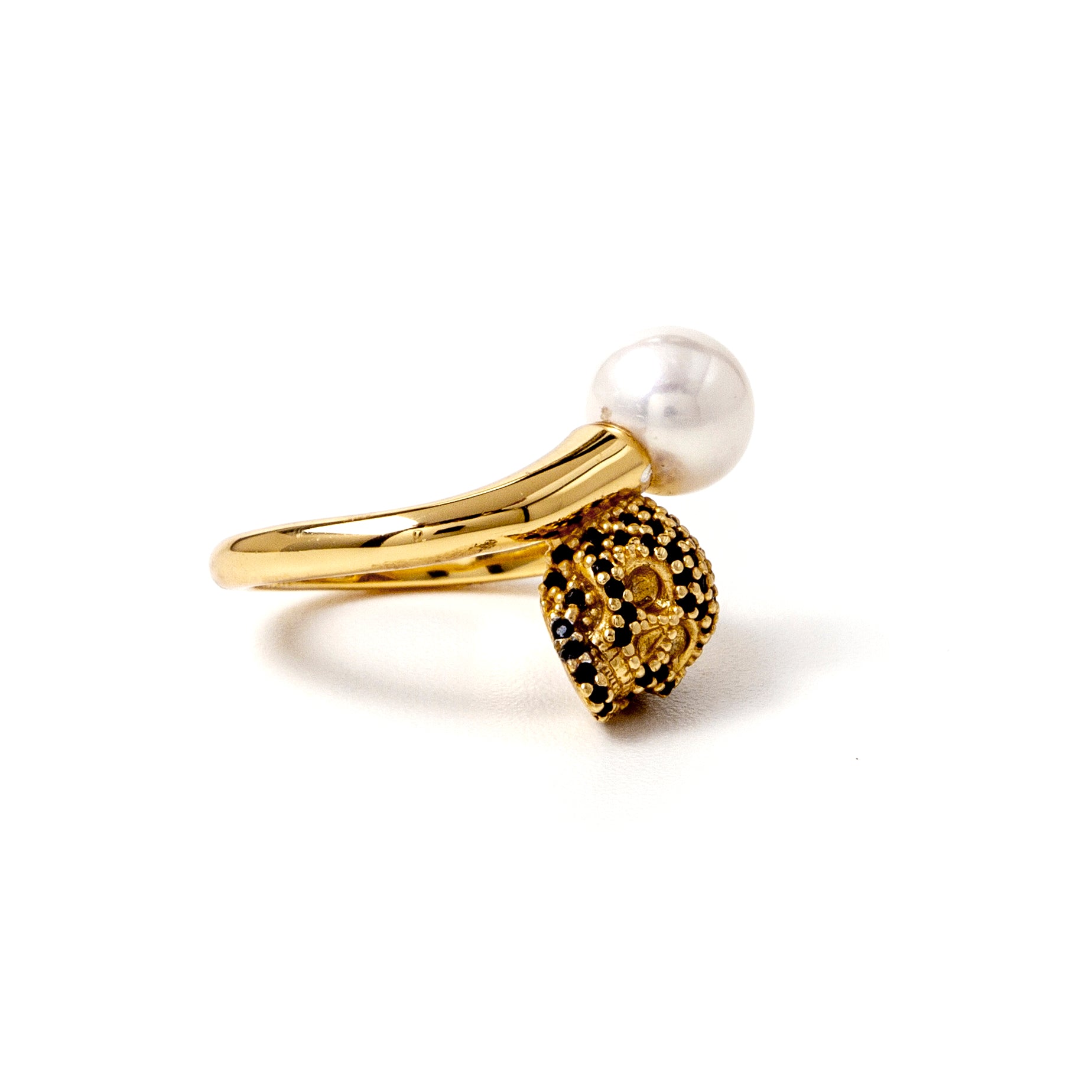 Anello realizzato con eccezionale maestria e attenzione ai dettagli, esprime eleganza e forza in una geometria armoniosa e sinuosa. Questo gioiello presenta un teschio tempestato di pietre, incastonate interamente a mano, contrapposte a una splendida perla naturale che dona luce e purezza all’intero design. La meticolosa attenzione ai dettagli, unita ai materiali di alta qualità e soprattutto all’originalità delle forme, rendono questo anello un gioiello senza tempo.